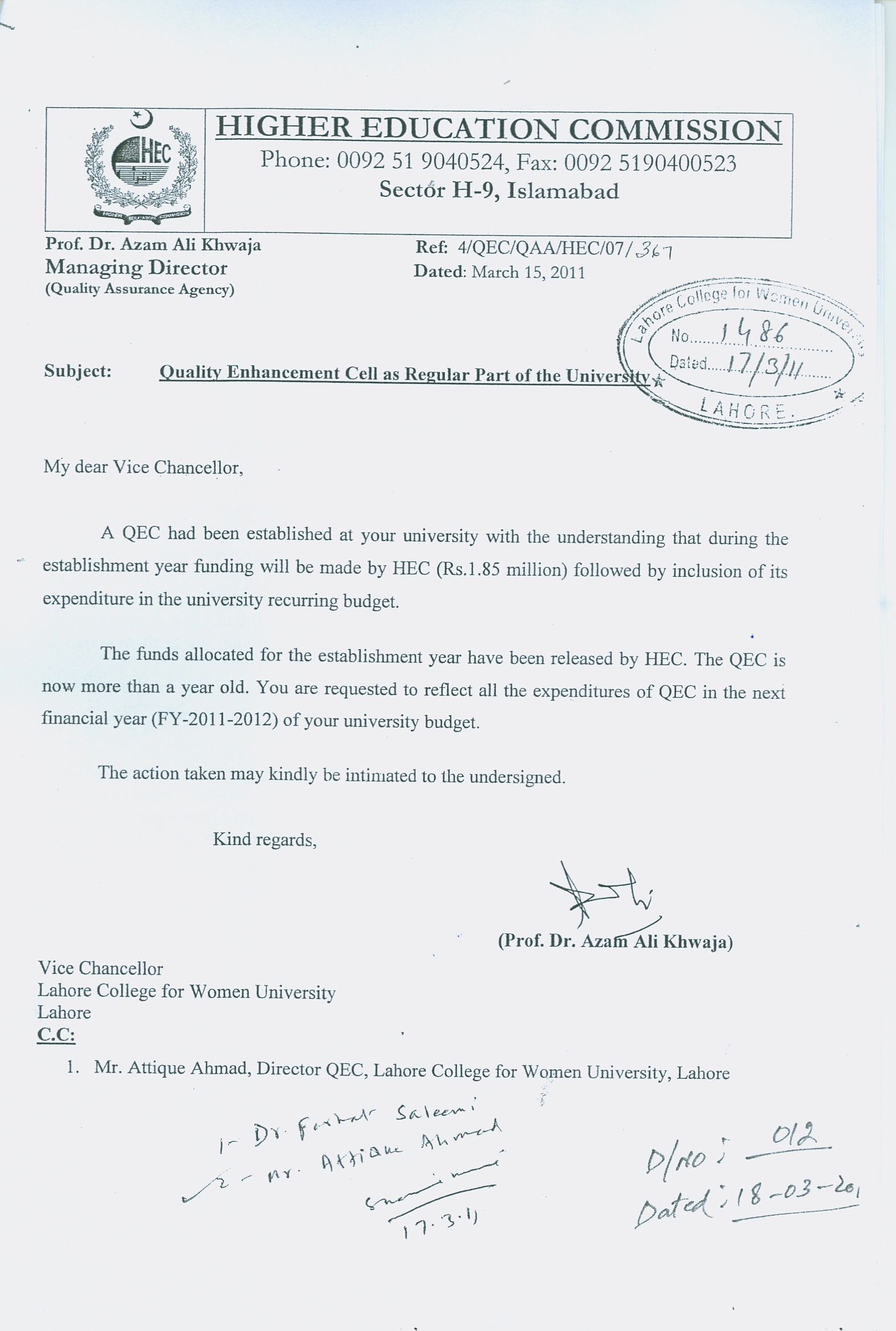 Membership Type: Institutional Email: vc.office@lcwu.edu.pk Year in which Organisation/Agency commenced operations: 1922 Countries/regions/states of operation: Pakistan Chief Executive Officer (CEO) Title: Prof. Dr. First Name: Farkhanda Surname: Manzoor Job Title: Vice Chancellor Phone: 042-992038301-9 Fax: 99201950 Email Id: drfarkhanda786@gmail.com Nominated Contact Person (if different from CEO) First Name: Samina Surname: Mazhar Job Title: Director QEC Email Id: director.qec@lcwu.edu.pk Organisation Details Lahore College for Women University, Lahore Address: Jail Road, 54000,Lahore Pakistan Website: www.lcwu.edu.pk Additional Contacts Criteria Requirements for Full Member1 Criterion: Nature of the operations of the agency: Measure: The agency is responsible for reviews at institutional or programme level of post-secondary education institutions or post-secondary quality assurance agencies Description: Applicable Only For Full Members 2 Criterion: Mission statement and objectives: Measure: The agency has formulated a mission statement and objectives which are consistent with the nature of the agency Description: Applicable Only For Full Members 3 Criterion: Agency staff, Numbers, Profile, Roles: Measure: The profile of the staff is consistent with the Mission Statement Description: Applicable Only For Full Members 4 Criterion: Profile of reviewers: Measure: The profile of the reviewers is consistent with the Mission Statement Description: Applicable Only For Full Members 5 Criterion: Independence: Measure: The judgements and recommendations of the agency’s reports cannot be changed by third parties Description: Applicable Only For Full Members 6 Criterion: Resources: Measure: The agency has sufficient resources to run its operations in accordance with its mission statement and objectives Description: Applicable Only For Full Members 7 Criterion: External quality assurance criteria and processes: Measure: The description of the processes and criteria applied should be transparent and publicly available and normally include: self evaluation, site visit, public report and follow-up measure Description: Applicable Only For Full Members 8 Criterion: Quality assurance: Measure: The description of the processes and criteria applied should be transparent and publicly available and normally include: self evaluation, site visit, public report and follow-up measure Description: Applicable Only For Full Members Criteria Requirements for Institutional MemberInstitutional Member Criteria: Measure: Institutional Members are institutions of higher education in the region that are in good standing with the relevant quality assurance agency if one exists. Proof of recognition as a Higher Education Institution: Quality Assurance Agency, Higher Education Commission, Pakistan http://www.lcwu.edu.pk/qec-introductions.html http://www.lcwu.edu.pk/qec-civic-engagements.html The APQN membership will improve the quality culture of our university which will be beneficial for all the stakeholders. As this network is Asia Pacific network and we are working as institution for women development in all respect, APQN will lead us towards a new horizon. Documents Upload: Download 'Regularize_QEC_Letter.jpg' Proof of the organisation’s good standing with the local QA agency: QEC at LCWU has obtained 90 score for the period of 2012-13 Criteria Requirements for Associate MemberAssociate Member Criteria: Measure:Associate Members are organisations with a major interest and active involvement in evaluation, accreditation and quality assurance in higher education, but without the responsibility for assuring the quality of institutions, education programs, or external quality assurance agencies Applicable Only For Associate Members Criteria Requirements for Intermediate Member1 Criterion: Nature of the operations of the agency: Measure: The agency is responsible for reviews at institutional or programme level of post-secondary education institutions or post-secondary quality assurance agencies Description: Applicable Only For Intermediate Members 2 Criterion: Mission statement and objectives: Measure: The agency has formulated a mission statement and objectives which are consistent with the nature of the agency Applicable Only For Intermediate Members 3 Criterion: : Proof of the organisation’s good standing with the local QA agency Applicable Only For Intermediate Members Criteria Requirements for ObserverCriterion For Observers: Measure: APQN accepts as Observers organisations outside the Asia-Pacific region, including: external quality assurance agencies; institutions with a major interest in evaluation, accreditation and quality assurance in higher education; other regional networks that have major interests in and strong links with the region Criteria Requirements for Observer: Applicable Only For Observers Documentation and Fees Documents Submitted Located in: APQN Members