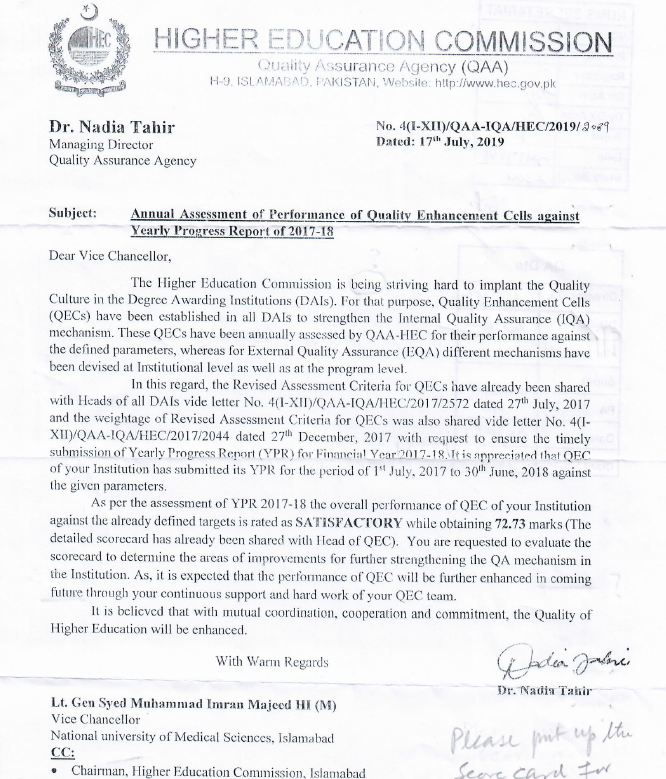 Membership Type: Institutional ![]() Email: m.ismail@numspak.edu.pk Year in which Organisation/Agency commenced operations: 2015 Chief Executive Officer (CEO) Title: Lt Gen First Name: Syed Muhammad Imran Surname: Majeed (Retd) Phone: +92-51-9270433 Fax: +92-51-9271619 Email Id: vcimran@numspak.edu.pk Alternative Email Id: vc@numspak.edu.pk Nominated Contact Person (if different from CEO) Title: Air Cdre First Name: Muhammad Surname: Ismail (Retd) Phone: +92-51-9274122 Fax: +92-51-9271619 Email Id: m.ismail@numspak.edu.pk Alternative Email Id: erummonis@numspak.edu.pk Organisation Details National University of Medical Sciences (NUMS) Address: The Mall, Rawalpindi, 46000. Pakistan Website: www.numspak.edu.pk Additional Contacts Criteria Requirements for Full Member1 Criterion: Nature of the operations of the agency: Measure: The agency is responsible for reviews at institutional or programme level of post-secondary education institutions or post-secondary quality assurance agencies Description: Applicable Only For Full Members 2 Criterion: Mission statement and objectives: Measure: The agency has formulated a mission statement and objectives which are consistent with the nature of the agency Description: Applicable Only For Full Members 3 Criterion: Agency staff, Numbers, Profile, Roles: Measure: The profile of the staff is consistent with the Mission Statement Description: Applicable Only For Full Members 4 Criterion: Profile of reviewers: Measure: The profile of the reviewers is consistent with the Mission Statement Description: Applicable Only For Full Members 5 Criterion: Independence: Measure: The judgements and recommendations of the agency’s reports cannot be changed by third parties Description: Applicable Only For Full Members 6 Criterion: Resources: Measure: The agency has sufficient resources to run its operations in accordance with its mission statement and objectives Description: Applicable Only For Full Members 7 Criterion: External quality assurance criteria and processes: Measure: The description of the processes and criteria applied should be transparent and publicly available and normally include: self evaluation, site visit, public report and follow-up measure Description: Applicable Only For Full Members 8 Criterion: Quality assurance: Measure: The description of the processes and criteria applied should be transparent and publicly available and normally include: self evaluation, site visit, public report and follow-up measure Description: Applicable Only For Full Members Criteria Requirements for Institutional MemberInstitutional Member Criteria: Measure: Institutional Members are institutions of higher education in the region that are in good standing with the relevant quality assurance agency if one exists. Proof of recognition as a Higher Education Institution: 1. First page of NUMS Act attached. 2. NUMS is listed on HEC Pakistan website at URL: https://www.hec.gov.pk/english/universities/Pages/Islamabad/National-University-of-Medical-Sciences.aspx Documents Upload: Download 'Nums1.png' Proof of the organisation’s good standing with the local QA agency: NUMS has established Quality Assurance Directorate / Quality Enhancement Cell, as per the requirement of Quality Assurance Agency (QAA) of Higher Education Commission of Pakistan.QAA regularly evaluates the performance of the Quality Enhancement Cell established at the Pakistani Universities. On the basis of the performance during fiscal year 2017-2018, the QAA awarded a score of 73% to QEC NUMS. For fiscal year 2018-2019 the QAA report is still awaited. Documents Upload: Download 'Nums2.png' Criteria Requirements for Associate MemberAssociate Member Criteria: Measure:Associate Members are organisations with a major interest and active involvement in evaluation, accreditation and quality assurance in higher education, but without the responsibility for assuring the quality of institutions, education programs, or external quality assurance agencies Applicable Only For Associate Members Criteria Requirements for Intermediate Member1 Criterion: Nature of the operations of the agency: Measure: The agency is responsible for reviews at institutional or programme level of post-secondary education institutions or post-secondary quality assurance agencies Description: Applicable Only For Intermediate Members 2 Criterion: Mission statement and objectives: Measure: The agency has formulated a mission statement and objectives which are consistent with the nature of the agency Applicable Only For Intermediate Members 3 Criterion: : Proof of the organisation’s good standing with the local QA agency Applicable Only For Intermediate Members Criteria Requirements for ObserverCriterion For Observers: Measure: APQN accepts as Observers organisations outside the Asia-Pacific region, including: external quality assurance agencies; institutions with a major interest in evaluation, accreditation and quality assurance in higher education; other regional networks that have major interests in and strong links with the region Criteria Requirements for Observer: Applicable Only For Observers Documentation and Fees Upon approval of my application I agree to pay:
