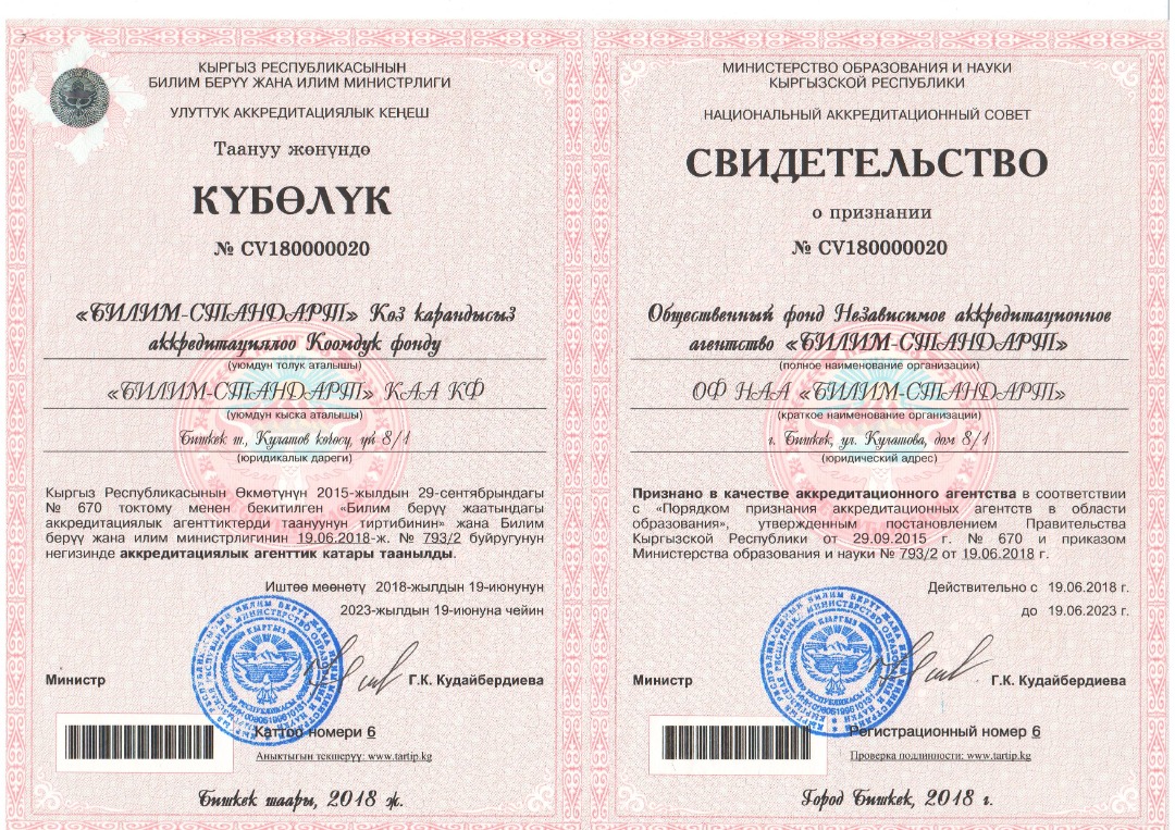 Membership Type: Full ![]() Email: bskg@bskg.agency Year in which Organisation/Agency commenced operations: 2017 Countries/regions/states of operation: Kyrgyzstan Chief Executive Officer (CEO) Title: Director First Name: Eric Surname: Esentaev Phone: +996312979 067 Email Id: bskg@bskg.agency Alternative Email Id: bskg@gmail.com Nominated Contact Person (if different from CEO) Title: Deputy Director First Name: Kubanychbek Surname: Chymbaev Phone: +996555773006 Email Id: vize@bskg.agency Alternative Email Id: vostorgkuba@gmail.com Organisation Details Public Foundation Independent Accreditation Agency “BILIM-STANDART” Address: apart. 18, 43 Chingiz Aitmatov, Bishkek Kyrgyzstan Website: https://www.bskg.agency/ Additional Contacts Criteria Requirements for Full Member1 Criterion: Nature of the operations of the agency: Measure: The agency is responsible for reviews at institutional or programme level of post-secondary education institutions or post-secondary quality assurance agencies Description: PF IAA “BILIM-STANDART” was founded in 2017 and recognized by the Ministry of Education and Science of the Kyrgyz Republic as an accreditation agency in 2018. The supreme bodies of the agency is the meeting of founders and supervisory board. Documents Upload: Download '1_License.jpeg' 2 Criterion: Mission statement and objectives: Measure: The agency has formulated a mission statement and objectives which are consistent with the nature of the agency Description: Mission: Promoting the education system in improving the competitiveness of graduates through the establishment and development of quality assurance systems Objectives: - to organize and conduct institutional and program accreditation of educational institutions, research organizations implementing educational programs of vocational and higher professional education, postgraduate education, additional adult education in according to the procedure established by law; - to develop standards and criteria for institutional and programmatic accreditation of educational organizations; - to organize and implement of post-accreditation procedures for monitoring educational programs and educational organizations - to provide information and analytical, consulting services on quality assurance of education - to participate in international quality assurance networks Documents Upload: Download '2_statute.pdf' 3 Criterion: Agency staff, Numbers, Profile, Roles: Measure: The profile of the staff is consistent with the Mission Statement Description: The staff is formed by the executive director (INQAAHE affiliated member), the deputy director (INQAAHE affiliated member) and accounter. 4 Criterion: Profile of reviewers: Measure: The profile of the reviewers is consistent with the Mission Statement Description: Since 2018, the agency has conducted 450 program accreditation and 4 institutional accreditation. The Agency engaged 8 international experts and 80 national experts for the accreditation procedure 5 Criterion: Independence: Measure: The judgements and recommendations of the agency’s reports cannot be changed by third parties Description: The agency has a Supervisory Board, which ensures the adoption of an independent and final decision on accreditation of educational organizations. The Supervisory Board of the agency includes employers, representatives of educational organizations and student communities, as well as representatives of state bodies and NGOs. 6 Criterion: Resources: Measure: The agency has sufficient resources to run its operations in accordance with its mission statement and objectives Description: The agency reached financial stability in 2019. For example, the equity of the agency increased in 2018 by $4 563, in 2019 it amounted to $8 674. 7 Criterion: External quality assurance criteria and processes: Measure: The description of the processes and criteria applied should be transparent and publicly available and normally include: self evaluation, site visit, public report and follow-up measure Description: The agency also reports annually 2 times a year to National Accreditation Council under the Ministry of Education and Science on the results of accreditation. Duration of recognition of the organization as accreditation the agency is 5 years. 8 Criterion: Quality assurance: Measure: The description of the processes and criteria applied should be transparent and publicly available and normally include: self evaluation, site visit, public report and follow-up measure Description: 1. The Agency's website, which contains approved criteria, standards, accreditation and decision-making procedures, and information on accreditation results; 2. Developed standards and criteria for institutional and programmatic accreditation that meet the established standards and criteria; 3. A methodological basis for the accreditation procedure of educational organizations and programs: guidelines for conducting the self-assessment procedure with institutional and program accreditation; external evaluations Criteria Requirements for Institutional MemberInstitutional Member Criteria: Measure: Institutional Members are institutions of higher education in the region that are in good standing with the relevant quality assurance agency if one exists. Proof of recognition as a Higher Education Institution: Applicable Only For Institutional Members Proof of the organisation’s good standing with the local QA agency: Applicable Only For Institutional Members Criteria Requirements for Associate MemberAssociate Member Criteria: Measure:Associate Members are organisations with a major interest and active involvement in evaluation, accreditation and quality assurance in higher education, but without the responsibility for assuring the quality of institutions, education programs, or external quality assurance agencies Applicable Only For Associate Members Criteria Requirements for Intermediate Member1 Criterion: Nature of the operations of the agency: 